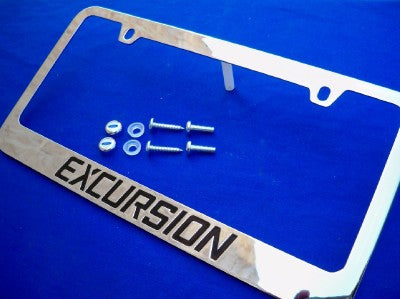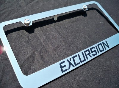Ford Excursion Chrome License Plate Frame Engraved Black w/ Logo Screw Caps