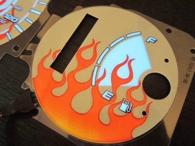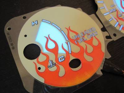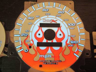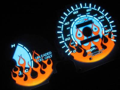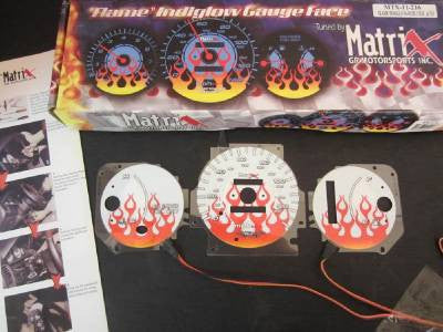 THIS AD IS FOR A NEW SET OF FLAMED GLOW GAUGES FROM MATRIX. THEY ARE REALLY UNIQUE IN DESIGN AND UNIQUE IN FUNCTIONALITY. PLEASE MAKE SURE TO COMPARE YOUR CLUSTER LAYOUT WITH THE PICTURES.