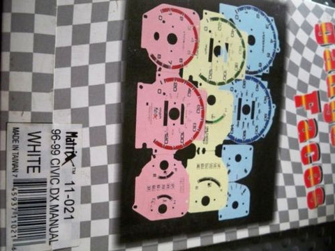 This kit lets you keep 100% of the OEM look and design while only the color is different. that way you make your cluster stand out and match your interior and style. YOU ARE LOOKING AT A VERY RARE TO FIND FACE GAUGES PRODUCT FROM MATRIX FITS HONDA 96-00 CIVIC DX WITH MANUAL TRANSMISSION AND WITHOUT TACHOMETER. PLEASE TAKE A CLOSE LOOK AT THE DETAILS AND QUALITY OF THIS SET. NO INSTALLATION INSTRUCTIONS ARE INCLUDED.